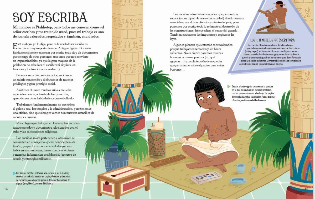 En el antiguo Egipto existieron muchos oficios y profesiones. Gracias al arte, la arqueología y los textos podemos conocer cómo era el trabajo de agricultores y ganaderos, pero también de escribas, sacerdotes, embalsamadores, soldados, artistas... todo el universo de los oficios que constituían la b...
