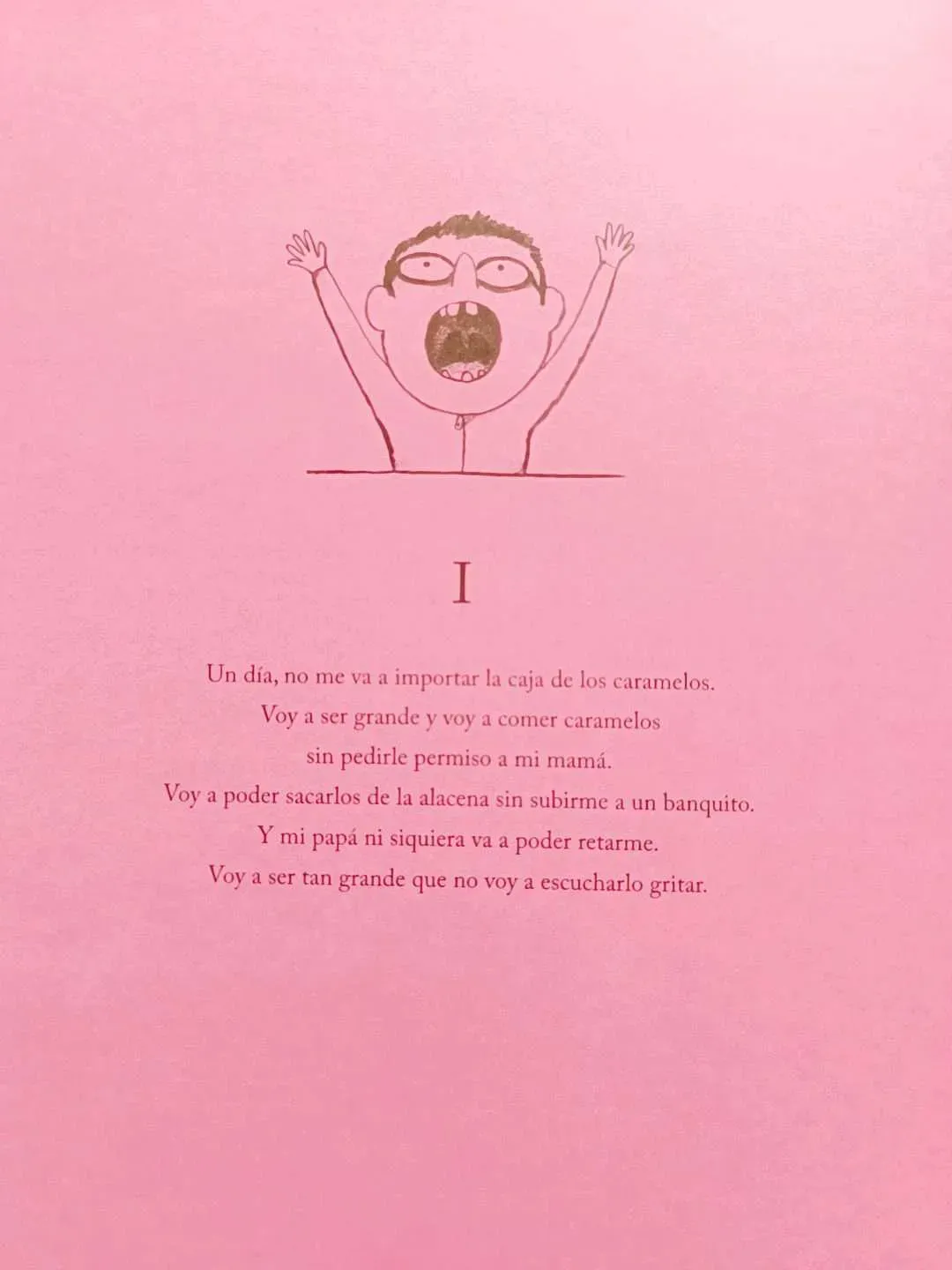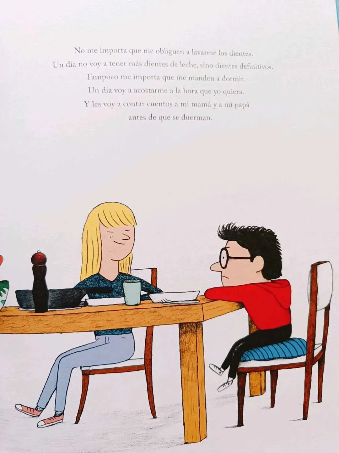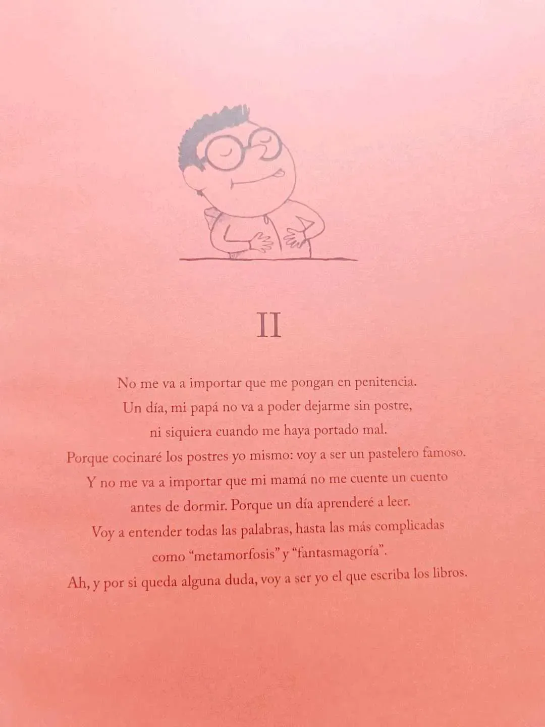 No me va a importar que me pongan en penitencia. Un día, mi papá no va a poder dejarme sin postre, ni siquiera cuando me haya portado mal. Porque cocinaré los postres yo mismo: voy a ser un pastelero famoso. Y no me va a importar que mi mamá no me cuente un cuento antes de dormir. Porque un día apre...