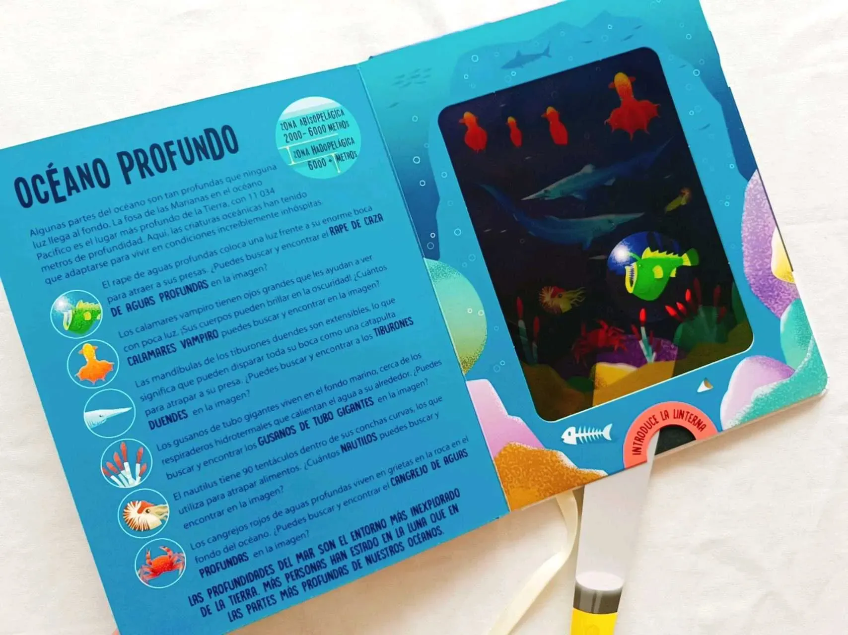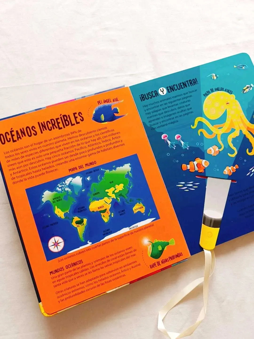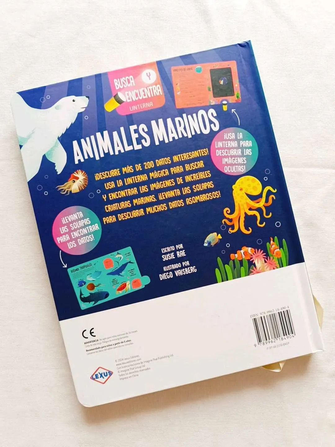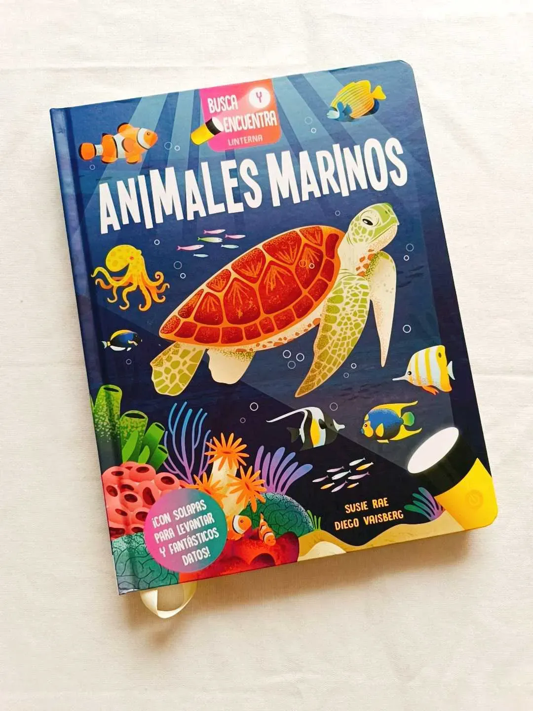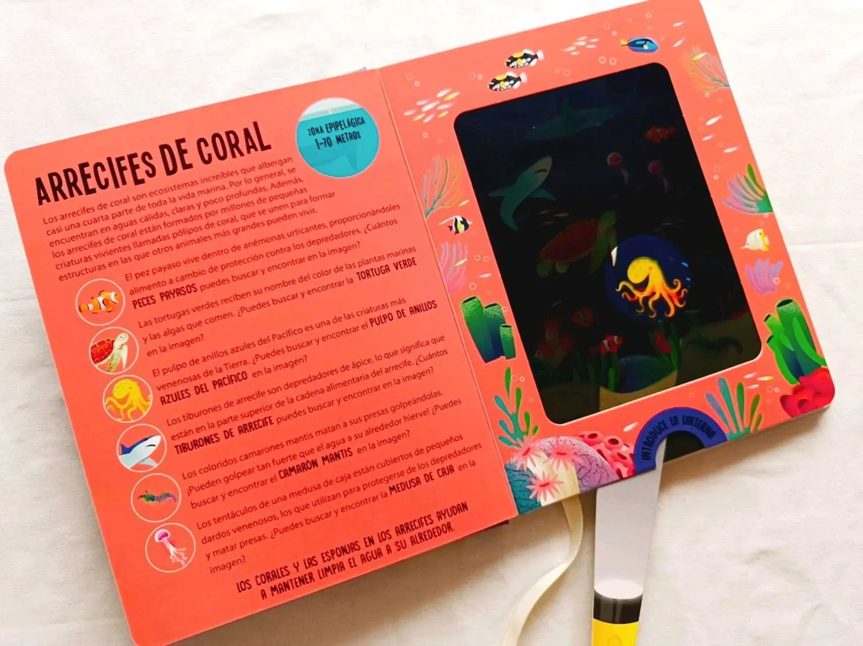 Animales Marinos ¡descubre más de 200 datos interesantes! ¡Usa la linterna mágica para buscar y encontrar las imágenes de increíbles criaturas marinas. ¡Levanta las solapas para descubrir muchos datos asombrosos!