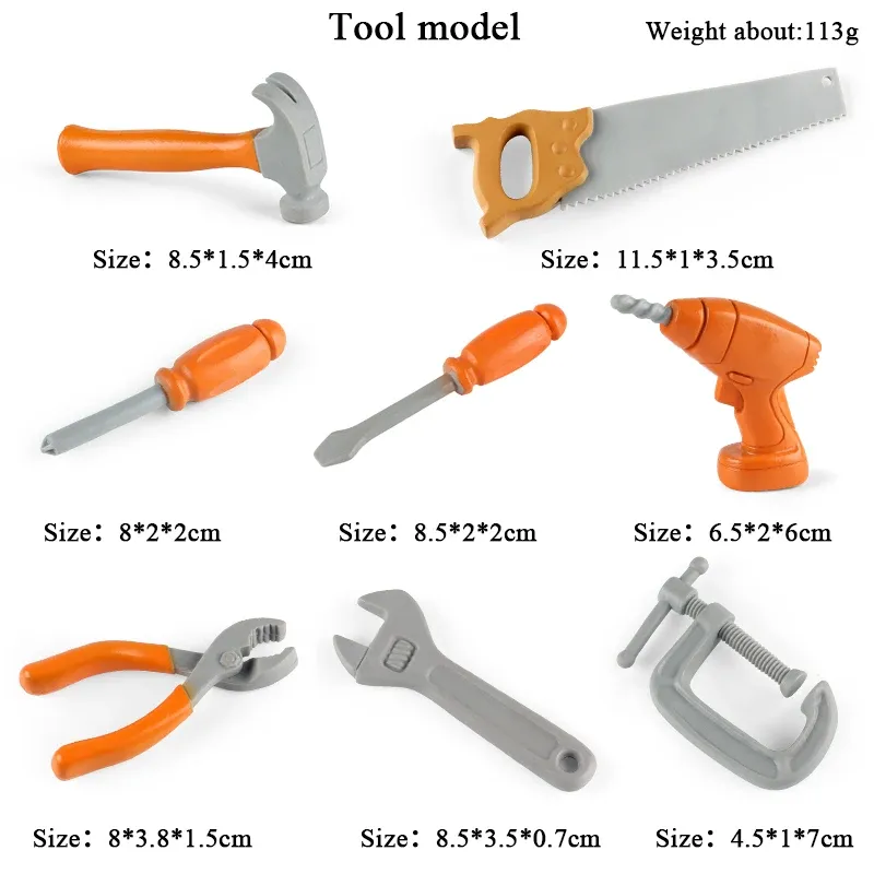 Incluye: tornillo de banco, taladro, 2 destornilladores, llave inglesa, alicates, sierra y martillo.